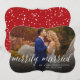 This modern and simple holiday/christmas wedding announcement card features the word 'Merrily Married' in a trendy script calligraphy overlaying a full bleed photo. The back of the card has a red background with white snow dots pattern.