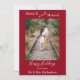This minimalist merry and almost married holiday card is the perfect greeting from an engaged couple. The design features classic typography against a dark red background with gold snowflakes. Photo template via Pixabay licensed under CC0 and must be replaced with your own photo
