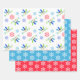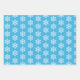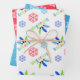 Colourful Christmas wrapping paper sheets, with a different pattern on each piece of paper. This collection of wrapping papers feature a white snowflake pattern, one two sheets, one with a light blue background, the other with a red background. The last piece of wrapping paper, in the set, has a white background, with a colourful blue, red and light green pattern of snowflakes and Christmas lights, with graphic text reading Merry and Bright.