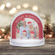 A red Christmas snow globe keepsake featuring two arch photos and Merry & Bright in elegant white serif lettering.