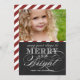 BLACK CHALKBOARD, MERRY AND BRIGHT PHOTO HOLIDAY GREETING CARD | DARK RED STRIPES. ELKE CLARKE© ELEGANT WHITE TEXT ON A CHALKBOARD PRINTED EFFECT BACKGROUND WITH RED AND WHITE DIAGONAL STRIPES PATTERN ON THE BACK. MAY YOUR DAYS BE MERRY AND BRIGHT