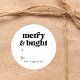 "Merry and bright." A wonderfully minimalist and modern round gift or favour sticker that enables you to personalise the design with your name in the "from" section.