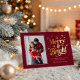 Send the brightest holiday wishes with this wonderfully vibrant photo card featuring a bold, split design. The rich deep red background perfectly highlights the large, shimmering gold foil message: "Merry & Bright," surrounded by scattered foil stars and festive greetings. Your cherished family photo is elegantly framed on the left, set against the same deep red for a modern, striking, and luxuriously joyful announcement.