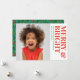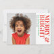Spread good cheer this Christmas with a Merry and Bright holiday photo card. This design has bold red text on the side for cheerful emphasis. Underneath is green text with a Merry Christmas greeting and your family's name. Beneath that are the names of your family members. Replace the sample photo with your desired family or holiday photo to spread good cheer all over the place! The back of the card has a festive red and green poinsettia pattern.
