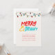 This holiday party invitation template features a festive and cheerful design with colourful Christmas lights strung across the top, adding a touch of holiday sparkle. At the centre, the phrase "Merry & Bright" is displayed in bold, vibrant colours, capturing the joyful spirit of the season. Below this, the party details are neatly arranged, ensuring all essential information is clearly presented while maintaining the lively and celebratory theme. This template is perfect for spreading holiday cheer and inviting guests to a memorable festive gathering.