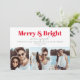 A modern " Merry and Bright" 3 photo collage Christmas/ Holidays engagement announcement card. The design features bold, red and modern typography. On the rear side of the card, the design features festive bright red colour and more customisable text.