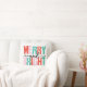 Fun Christmas throw pillow features text of red, teal green, pink, and black that reads Merry and Bright!