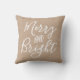 Merry and bright Script Handwriting | Holiday Throw Pillow in kraft and white. Modern farmhouse typography design by Blackberry Boulevard "Merry and Bright" written in a white script font on a kraft colour background. Other colours available in store. Perfect accent pillow for your holiday home decor.
