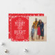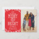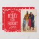 "Merry & Bright" themed Christmas photo card features a portrait photo, red background colour (which can be customised to match your photo), frame of white stars and snowflakes, and winter snow pattern on the back of the card.