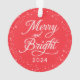 Simple and modern photo Christmas ornament design features a round picture framed by a pattern of twinkle lights and stars. The back of the ornament includes "Merry and Bright" in elegant script text with custom text for the year. The festive bright red background colour can be modified.