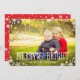 "Merry & Bright" themed Christmas photo card features a landscape photo and white overlay design with frame of stars and snowflakes. A winter snow pattern dresses up the back of the card, which includes a red background colour that can be customised to coordinate with your photo.