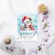 Create a stylish personalised Christmas card with a festive design that features a cute penguin in a red Santa hat sitting with a tiny snowman. This design has some real gold foil elements on the front side. A Merry & Bright saying and template text for greetings, family name and a year are on the card's front side. On the backside, there is a 2025 calendar (Sunday through Saturday).