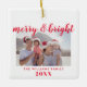 Modern Minimalist Family Photo Merry and Bright Christmas Ornament, Features elegant calligraphy script font Merry & Bright. Personalise your family name and year.