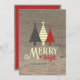 Elegant, unique, simple, black yellow and red Merry and Bright modern retro Christmas greeting card, with colourful pine trees, rustic wood and photo at the back.