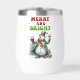 A funny and cheerful Christmas design showcases a jolly snowman dressed in a long green coat with a matching top hat, red scarf, and mittens. He holds a glass of red wine in one hand and white wine in the other. The festive red and green text reads, "Merry and bright." This design is available on a variety of products, making it a perfect gift for wine lovers.