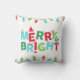 A whimsical Christmas pillow with the phrase 'Merry and Bright' in bright shades of red, green, and teal.