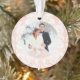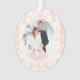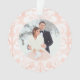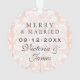 Personalize this elegant wedding newlywed keepsake holiday ornament with your favorite portrait from the wedding day (tip: crop photo to square shape before uploading). A pretty blush pink linen vintage damask pattern frames the photo and provides a decorative background to the stylish custom 'Merry and Married' monogram text on the back.
