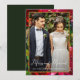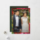 Beautiful red watercolor floral and greenery with elegant merry and married calligraphy on dark forest green Christmas holiday greeting, features the new couple's photo and their name in simple white text.