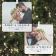 Celebrate the joy of newleywed life with this charming Christmas ornament, featuring a clean white rectangle at the bottom of both the front and back that displays "Merry & Married," along with the bride and groom's names and their wedding year. The design combines bold serif fonts with script handwriting typography for a touch of elegance. It also includes two customisable photo spaces and a transparent white wash for an ethereal look, making it a thoughtful gift for newlyweds to cherish their first Christmas together. If you'd like the photo to be bright and normal, just remove the transparent white layers in the editing tool. Minimalist Merry And Married Christmas Photo Metal Ornament