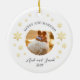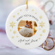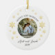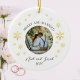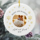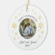 Commemorate your special day with our Merry and Married Christmas ornament featuring your wedding photo. Set against a white background with delicate gold snowflakes, this ornament is adorned with an informal, casual handwritten script, perfect for adding a personalised touch. Customise with the couple's name and wedding date. This thoughtful keepsake is a beautiful gift for newlyweds to celebrate their first Christmas together. Ideal for cherishing memories and adding a personal, elegant touch to your holiday decor!