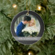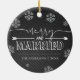Merry And Married Typography First Christmas Photo Ceramic Ornament . MERRY and MARRIED written in white fun font on a black background with snow flakes , makes the Christmas Ornament look elegant and very festive. The design can be fully customised by changing the photo and the text.