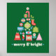 A Merry & Bright Christmas illustration for the Christmas holidays. Stylised illustrations of gifts, candy-canes, stockings, ornaments create a fun and colourful tree. Colours includes traditional Christmas colours of green and red, as well as blue, pink and light green.