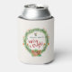 A Christmas can cooler with a watercolor wreath. Green pine needles, pine cones and decorative berries make up this festive wreath. Inside the wreath are some decorative ornaments and the words" may your days be Merry & Bright. Written in a trendy red font.