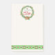 Christmas post-it notes with a watercolor wreath. Green pine needles, pine cones and decorative berries make up this festive wreath. Inside the wreath are some decorative ornaments and the words" may your days be Merry & Bright. Written in a trendy red font. A green and red pattern with whimsical squares along the border.