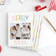 This holiday card design features a modern and playful layout, perfect for spreading seasonal cheer. The "Merry" greeting is displayed in colour block text at the top, complementing the warm, cheerful theme. The card is divided into three photo frames, allowing personalisation with family photos, making it perfect for sharing memories from throughout the year. Accents of soft beige, pastel green, vibrant purple, and blush pink give the design a cosy, festive aesthetic. Customisable text at the bottom offers space for a personalised message from your family.