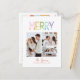 This holiday card design features a modern and playful layout, perfect for spreading seasonal cheer. The "Merry" greeting is displayed in colour block text at the top, complementing the warm, cheerful theme. The card is divided into three photo frames, allowing personalisation with family photos, making it perfect for sharing memories from throughout the year. Accents of soft beige, pastel green, vibrant purple, and blush pink give the design a cosy, festive aesthetic. Customisable text at the bottom offers space for a personalised message from your family.