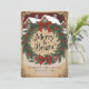 The phrase "Merry & Bright" is elegantly scripted at the centre, conveying heartfelt wishes for a joyful and luminous holiday season. Below the wreath, the playful text "MARPPY SHCIDAYS CIOTTAGE CORD" adds a whimsical touch, while "THES FALTS & ANOT PINER TOORN" enhances the vintage charm of the design. The background showcases a cosy winter scene with a snow-covered house, complete with chimneys and warm lights, evoking a sense of comfort and nostalgia. The ornate gold frame around the card adds a touch of elegance, making it perfect for mailing or gifting during the Christmas season.