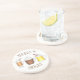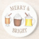 Sandstone coaster features an original marker illustration of a row of classic holiday drinks: egg nog, hot chocolate, and hot buttered rum.