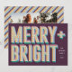 This festive Christmas card features the phrase "Merry + Bright" in a marquee light-inspired typographic design. The vibrant colour palette adds to the cheerful appeal, making this holiday card perfect for families with kids. The back of the card features a beloved family photo with a coordinating stripe pattern frame, or remove the photo and frame to reveal an all-over stripe pattern.