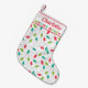 Celebrate in style with this festive Christmas stocking featuring a colourful string light pattern and bold “Merry + Bright” typography across the top. Personalise it with a name to create a one-of-a-kind holiday keepsake! The vibrant red, green, and teal colour palette makes this modern stocking a perfect addition to family mantels, holiday gift displays, or as a fun seasonal gift.