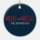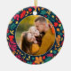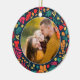 Multi-colour leaf pattern with a navy background and photo. This ornament features Merry and Bright on the back as well as being monogrammed.