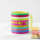 Celebrate the holidays in bright modern style with this merry rainbow stripe holiday mug, A colourful gift that is certain to delight family, friends, and co-workers who appreciate colour with their coffee or tea. Bright striped background with a star topped geometric stripe Christmas tree. merry text completes the festive vibes.