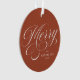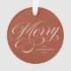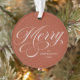Elegant Christmas ornament featuring "Merry" on the front in a white calligraphy script overlay with a terracotta brown background. Personalise the front of the ornament by adding your name and the year in white lettering. The back of the ornament displays your photo.