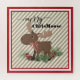 This whimsical moose is just adorable with a red ribbon bow tied around his neck. He's standing amongst pine boughs and berries. The text above reads "Merry ChrisMoose". Background is a tan and white diagonal stripe. This makes a fun, festive holiday puzzle for the kids and the adults!
