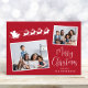 Festive red holiday card featuring 2 photos scattered in white frames, a white silhouette of reindeers flying Santa's sleigh, "Merry Christmas" in a stylish white script and your name in simple modern white typography.