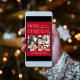 Elegant red folded holiday photo greeting card featuring "Merry Christmas" in stylish vintage white typography, "happy new year" and a greeting in modern white typography, three of your favourite family photos and your name. Personalise your seasonal message on the inside.
