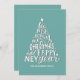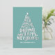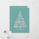 "We wish you a Merry Christmas and Happy New Year" card with green cute typography lettering in shape of pine for winter holidays.