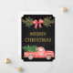 "MERRY CHRISTMAS" Greeting Card has the iconic red pick-up truck hauling away the family Christmas tree, ready for decorating. The top has a bough of branches and berries adorned with a red bow. The centre has a traditional font, in a mustard-gold colour, and the words "MERRY CHRISTMAS".