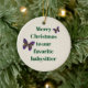 Wish your favourite babysitter or your nanny a Merry Christmas with this holiday ornament. The front of the ornament features the text, "Merry Christmas to our favourite babysitter" along with two colourful butterflies that flutter around the text. The back is blank allowing you to add additional text or a picture to personalise. All text as well as the solid background colour can be customised to suit your needs.