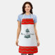 This holiday apron starts with a white background. On the top and bottom, there's a thick red boarder, with a gold colour glitter wave. In the centre there is an evergreen tree and the words “Merry Christmas”. Text can be customised .