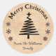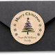This is a description of a Christmas-themed sticker. The sticker features the words "Merry Christmas" in black font, set against a kraft-coloured background. In the centre of the sticker is an image of a Christmas tree adorned with snowflakes. The sticker has a classic round shape.