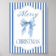 Classic Christmas poster with a watercolor blue ribbon bow and striped blue-and-white background. A perfect holiday wall art piece for cheerful seasonal decorating or gift giving.