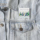 A festive Merry Christmas button pin decorated with holiday trees drawn in black pen and ink with watercolor with different patterns of stripes, chevrons and checks.