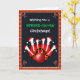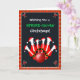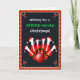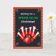 This festive Christmas bowling greeting card features Santa-themed bowling pins and a bright red holiday bowling ball set against a cheerful Christmas plaid background the perfect design to spread seasonal fun and party cheer.
