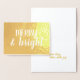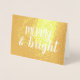 This beautiful and elegant card is perfect for everyone on Christmas card list! The front has a background of real gold foil. The words "MERRY & bright" are in white brush (brushstroke) calligraphy, in a combination of print and script lettering. Inside, the customisable message reads "may your days shine with joy," in a matching gold tone script.