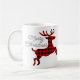 Unique, fashionable and trendy December winter holiday coffee mug with a cute image of a red and black Buffalo Check patterned male deer silhouette and Merry Christmas wish in an elegant stylish typography font script.